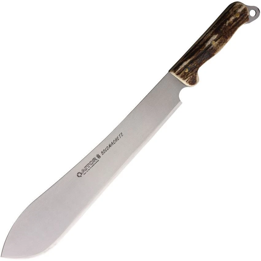 Model – AI16008A. Bolo Machete. 19.5 inch (49.53cm) overall. 13.75 inch (34.93cm) satin finish stainless blade. Stag bone handle. Full, extended tang. Lanyard hole. Brown leather belt sheath. Boxed. Made in Spain.