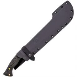 Model – CTK10281225HC. 19 inch (48.26cm) overall. 12.25 inch (31.12cm) blasted satin finish 1075HC steel blade. Walnut handle. Blade etching. Full, extended tang. Lanyard hole. Black leather belt sheath. Boxed. Made in El Salvador