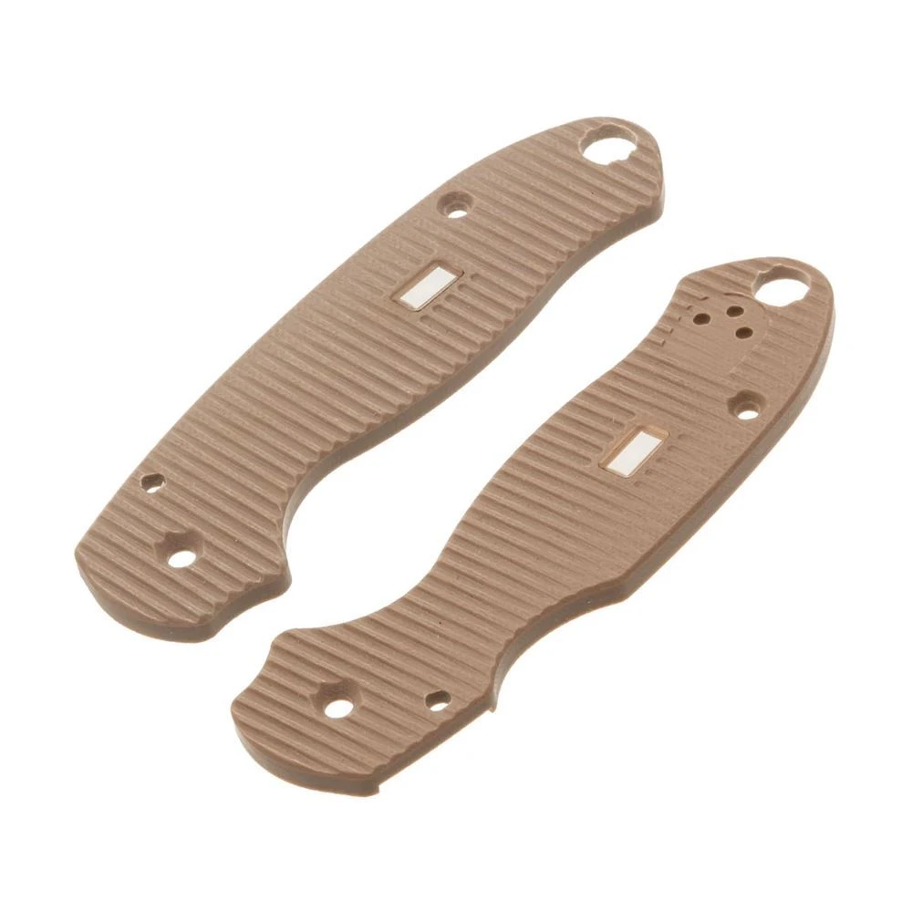 Model – GLRKSPMDT. Custom Spyderco Para Scales. Desert tan grooved G10 construction with two XL Tritium lamps. CNC machined. Not compatible with Lightweight model. Bulk packed. Made in China.