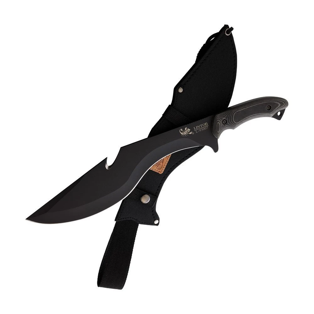 Model – L93007. Linton Machete Black. 17″ (43.18cm) overall. 12″ (30.48cm) black powder coated stainless blade. Black micarta handle. Belt/cord cutter. Full, extended tang. Lanyard hole. Black nylon belt sheath. Boxed. Made in Taiwan.