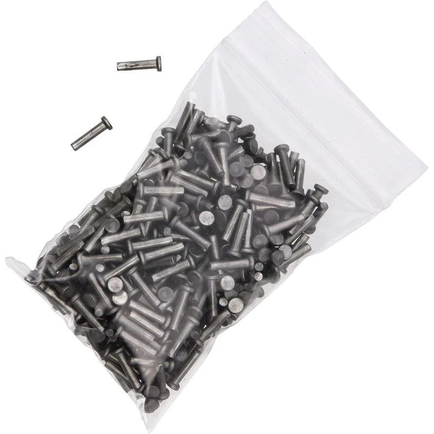 Model – S5. Schrade S5 – Knifemaking Handle Pins with Steel construction. Steel construction. 1/8″ head diameter. 3/8″ overall. Packaged in 2″ x 3″ zip-up plastic baggie. These handle pins are great for the Knifemaking Enthusiast. Packaged in zip-up plastic baggie. Each bag is full, however the number of pins will vary slightly from bag to bag. (Measurements given are approximate and may vary slightly from lot to lot). Proudly made in the USA.